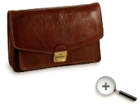 Front flap, zipped pocket on back, wrist strap, pocket on front, single gusset, unlined.
